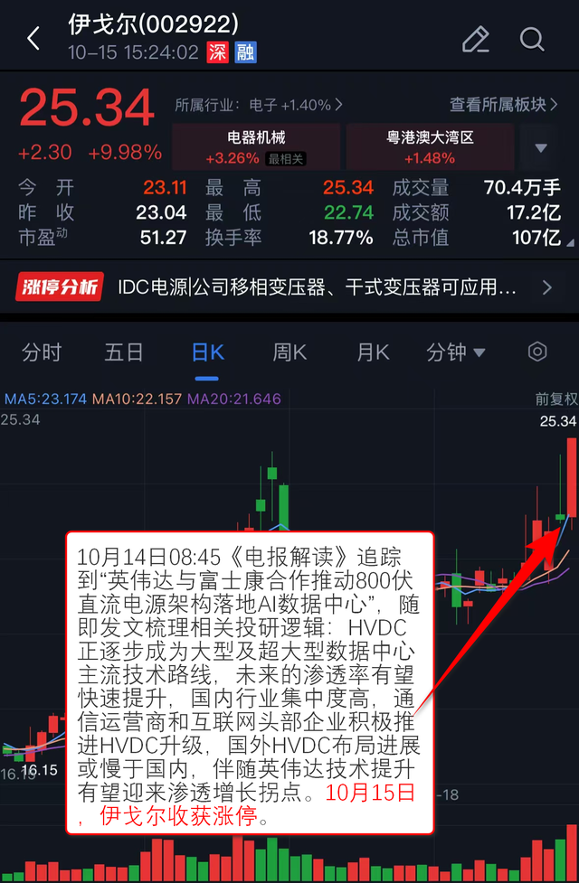 10月14日08:45《电报解读》 追踪到“英伟达与富士康合作推动800伏直流电源架构落地AI数据中心”,随即发文梳理相关投研逻辑:HVDC正逐步成为大型及超大型数据中心主流技术路线,未来的渗透率有望快速提升,国内行业集中度高,通信运营商和互联网头部企业积极推进HVDC升级,国外HVDC布局进展或慢于国内,伴随英伟达技术提升有望迎来渗透增长拐点。10月15日,伊戈尔收获涨停。