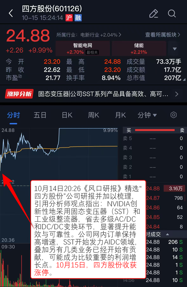 10月14日20:26《风口研报》 精选“四方股份”公司研报并加以梳理,引用分析师观点指出:NVIDIA创新性地采用固态变压器(SST)和工业级整流器,省去多级AC/DC和DC/DC变换环节,显著提升能效与可靠性。公司网内订单保持高增速,SST开始发力AIDC领域,叠加另有几类业务已经开始有贡献,可能成为比较重要的利润增长点。10月15日,四方股份收获涨停。