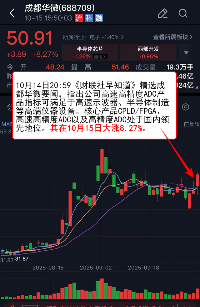 10月14日20:59《财联社早知道》 精选成都华微要闻,指出公司高速高精度ADC产品指标可满足于高速示波器、半导体制造等高端仪器设备。核心产品CPLD/FPGA、高速高精度ADC以及高精度ADC处于国内领先地位。其在10月15日大涨8.27%。