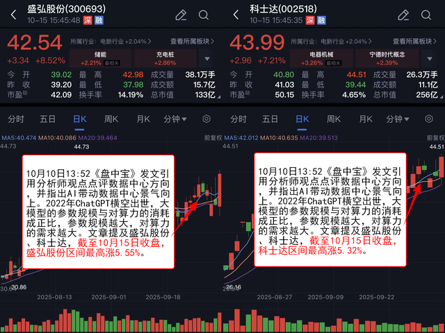 10月10日13:52《盘中宝》 发文引用分析师观点点评数据中心方向,并指出AI带动数据中心景气向上。2022年ChatGPT横空出世,大模型的参数规模与对算力的消耗成正比,参数规模越大,对算力的需求越大。文章提及盛弘股份、科士达,截至10月15日收盘,科士达区间最高涨5.32%,盛弘股份区间最高涨5.55%。