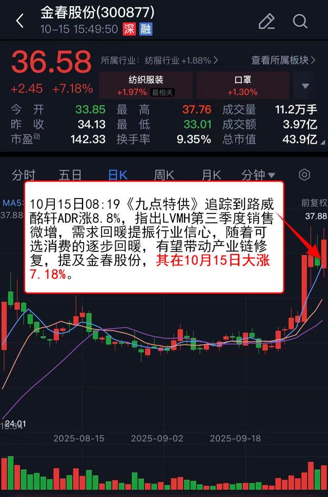 10月15日08:19《九点特供》 追踪到路威酩轩ADR涨8.8%,指出LVMH第三季度销售微增,需求回暖提振行业信心,随着可选消费的逐步回暖,有望带动产业链修复,提及金春股份,其在10月15日大涨7.18%。