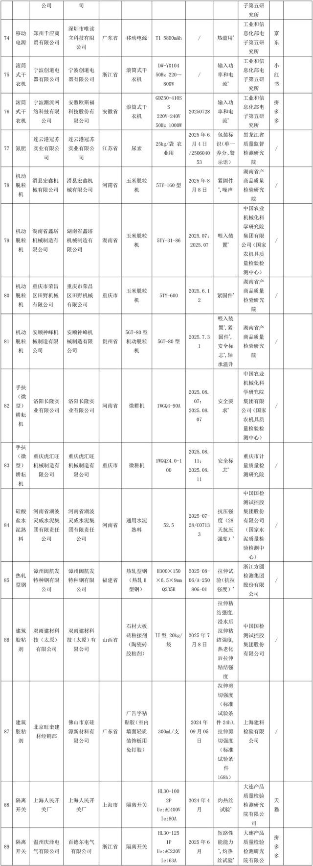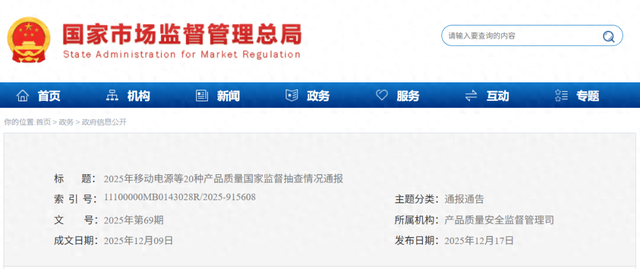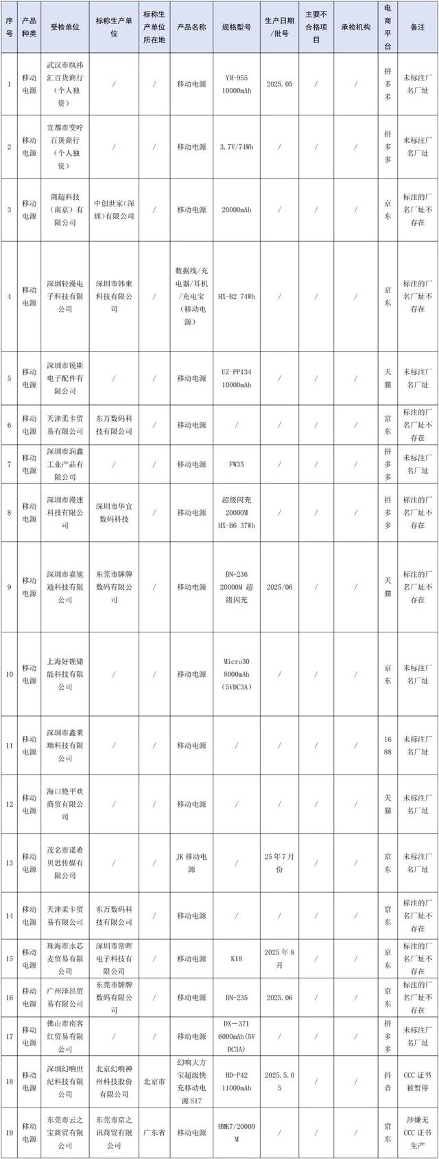1. 2025年移动电源等20种产品质量国家监督抽查不合格产品及生产销售单位名单