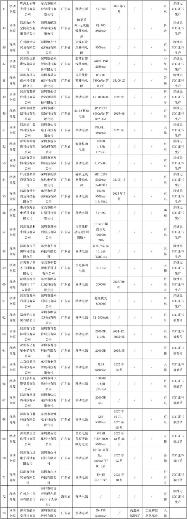 (一)移动电源。共抽查260批次产品,其中在淘宝、天猫、京东、拼多多等16家平台232家销售单位抽查256批次产品,在浙江、广东、安徽、上海等4个省份4家销售单位抽查4批次产品,抽查发现74批次不合格产品,其中,9批次产品未标注厂名厂址、8批次产品标注的厂名厂址不存在、44批次产品涉嫌无CCC证书生产、4批次产品CCC证书被暂停、3批次产品CCC证书被撤销、4批次产品CCC证书被注销,已交由属地市场监管部门处理;有1批次产品高温外部短路不合格、1批次产品热滥用不合格,均为安全项目。