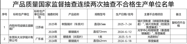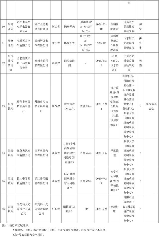 (二十)眼镜镜片。在江苏、浙江、福建、广东、上海、安徽等6个省份85家生产单位抽查85批次产品,抽查发现4批次产品不合格,其中,有1批次产品镜片顶焦度(球镜顶焦度偏差)和镜片顶焦度(柱镜顶焦度偏差)不合格、1批次产品光学中心和棱镜度(水平棱镜偏差)不合格、1批次产品光透射比不合格,均为安全项目;1批次产品厚度偏差不合格。