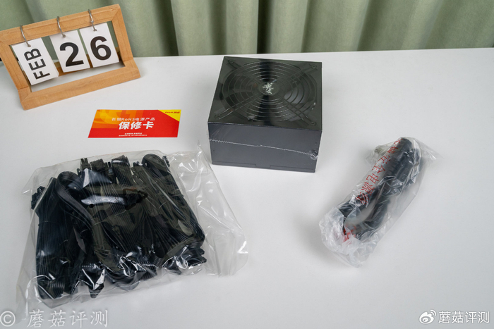 ▼包装内部,电源主体还有塑封包着,旁边是模组线和电源线,以及一张保修卡。