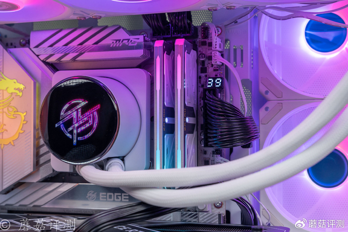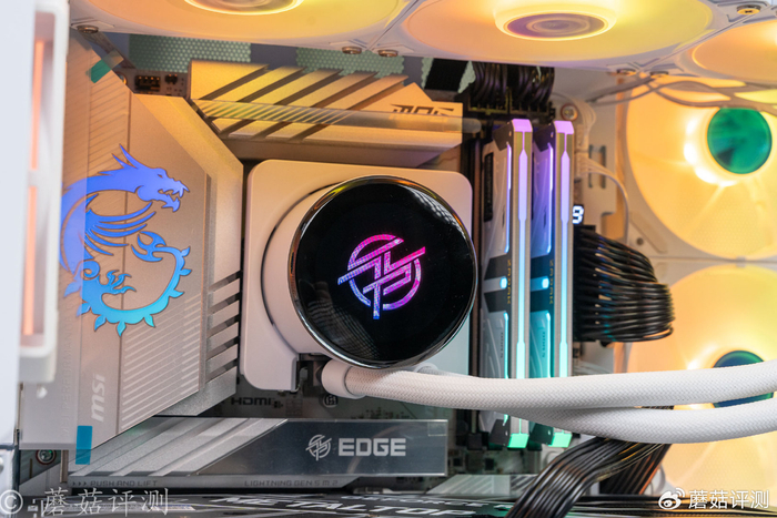 ▼处理器是265K,搭配的主板是微星的Z890刀锋钛主板,这块主板的用料很出色,颜值也很漂亮,左侧金属供电散热件的表面还有微星的龙标LOGO,支持ARGB灯效。