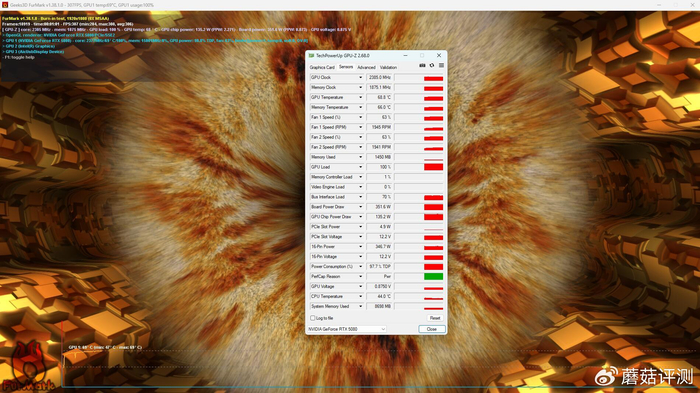 ▼跑个甜甜圈测试,显卡整体功耗在350W左右,核心温度在68.8℃左右。
