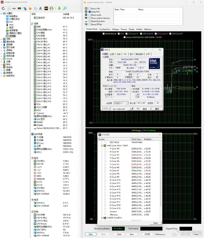 ▼简单跑个CPU-Z的压力测试,处理器功耗在185W左右,P核睿频5.2GHz、E核睿频4.6GHz,温度在76℃左右。