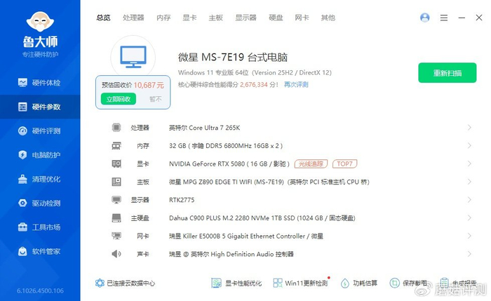 ▼整机配置一览,处理器是265K,主板是微星的Z890刀锋钛,显卡是影驰的RTX 5080金属大师黑金版OC。