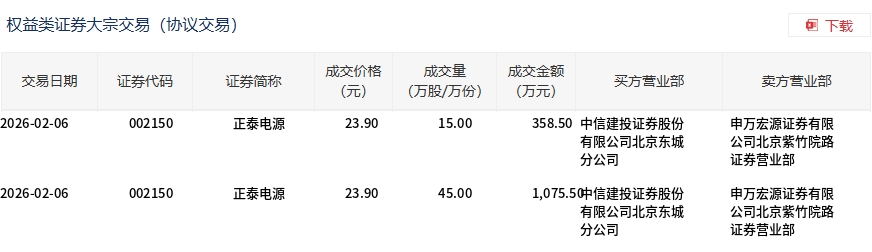 2月6日,正泰电源(维权)大宗交易成交60万股,成交额1434万元,占当日总成交额的2.71%,成交价23.9元,较市场收盘价25.73元折价7.11%。